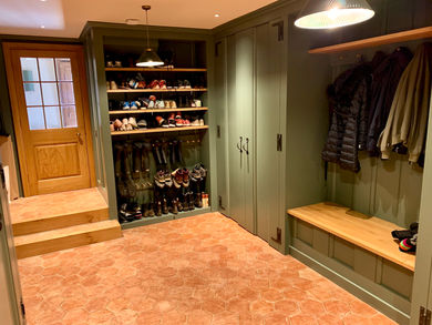 This substantial farmhouse near Hungerford with a barn wing, presented an opportunity to transform this barn space into a wonderful kitchen, living and dining space with a home office located on a mezzanine floor with glass balustrading to allow views between. Purpose made flooring and boarding to line the roof give a rich and cossetting feeling within a large space punctuated by the reclaimed barn frame. Children’s TV den, together with a laundry room and generous boot room complete the barn wing additions to the house.